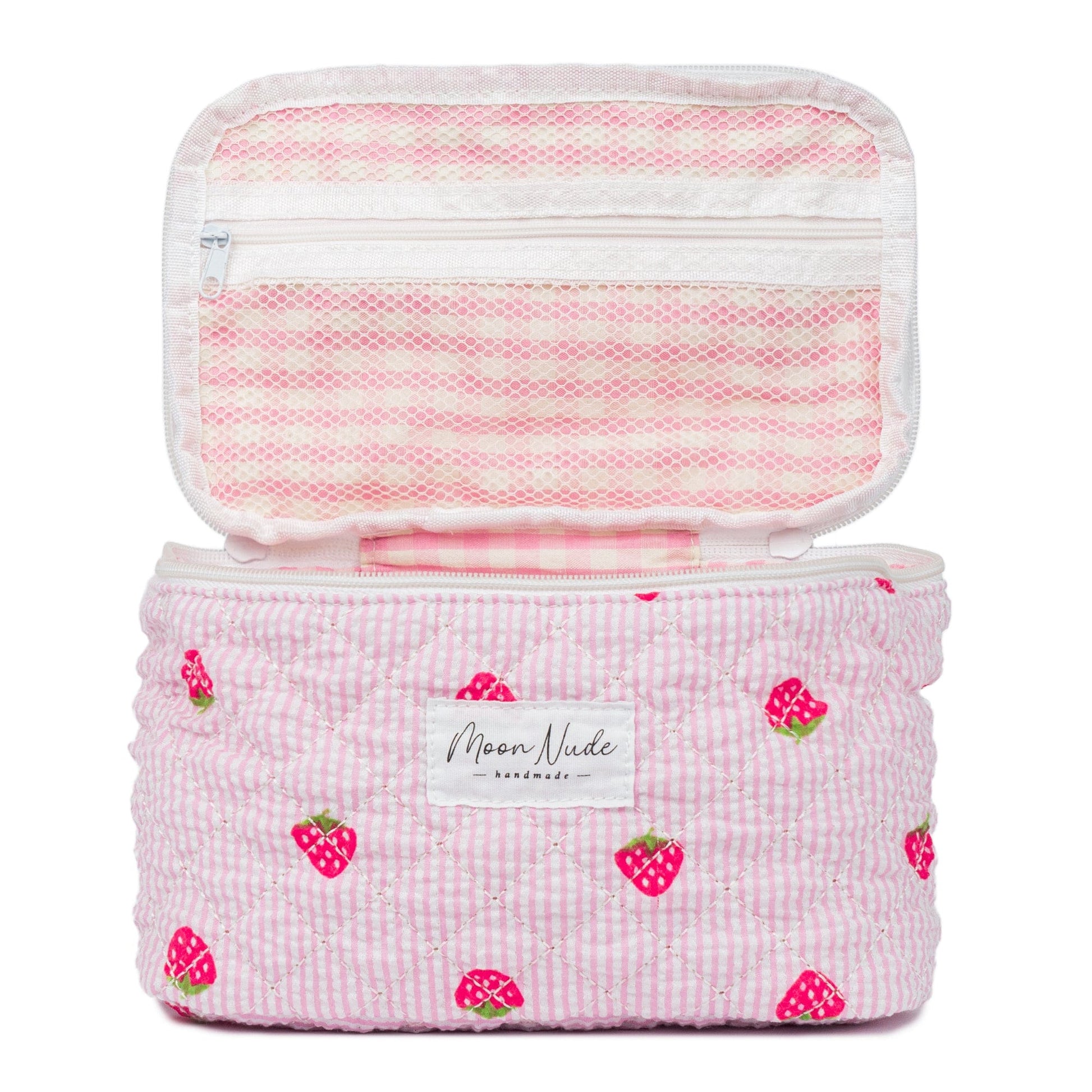 The quilted exterior features a beautiful strawberry-themed pattern, complemented by a classy pink gingham interior.